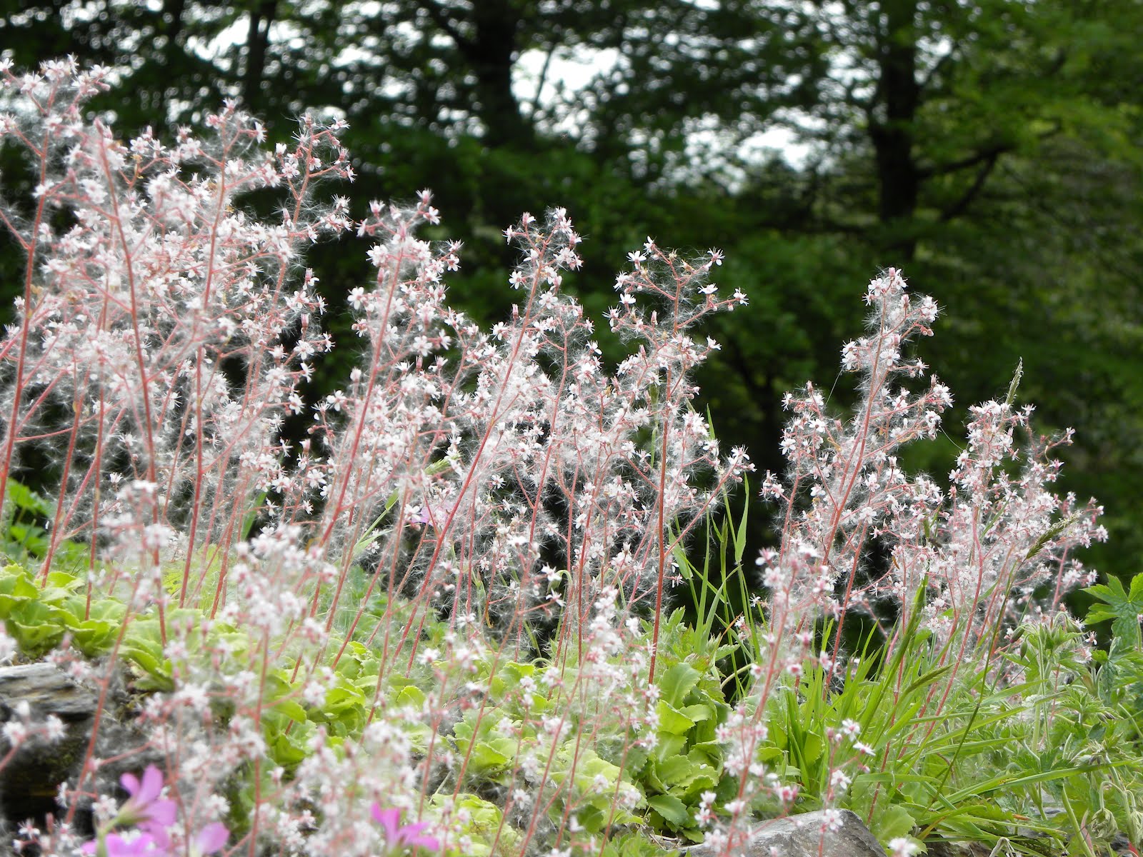 The London Pride looks almost white with the fluff of trapped willow seeds.