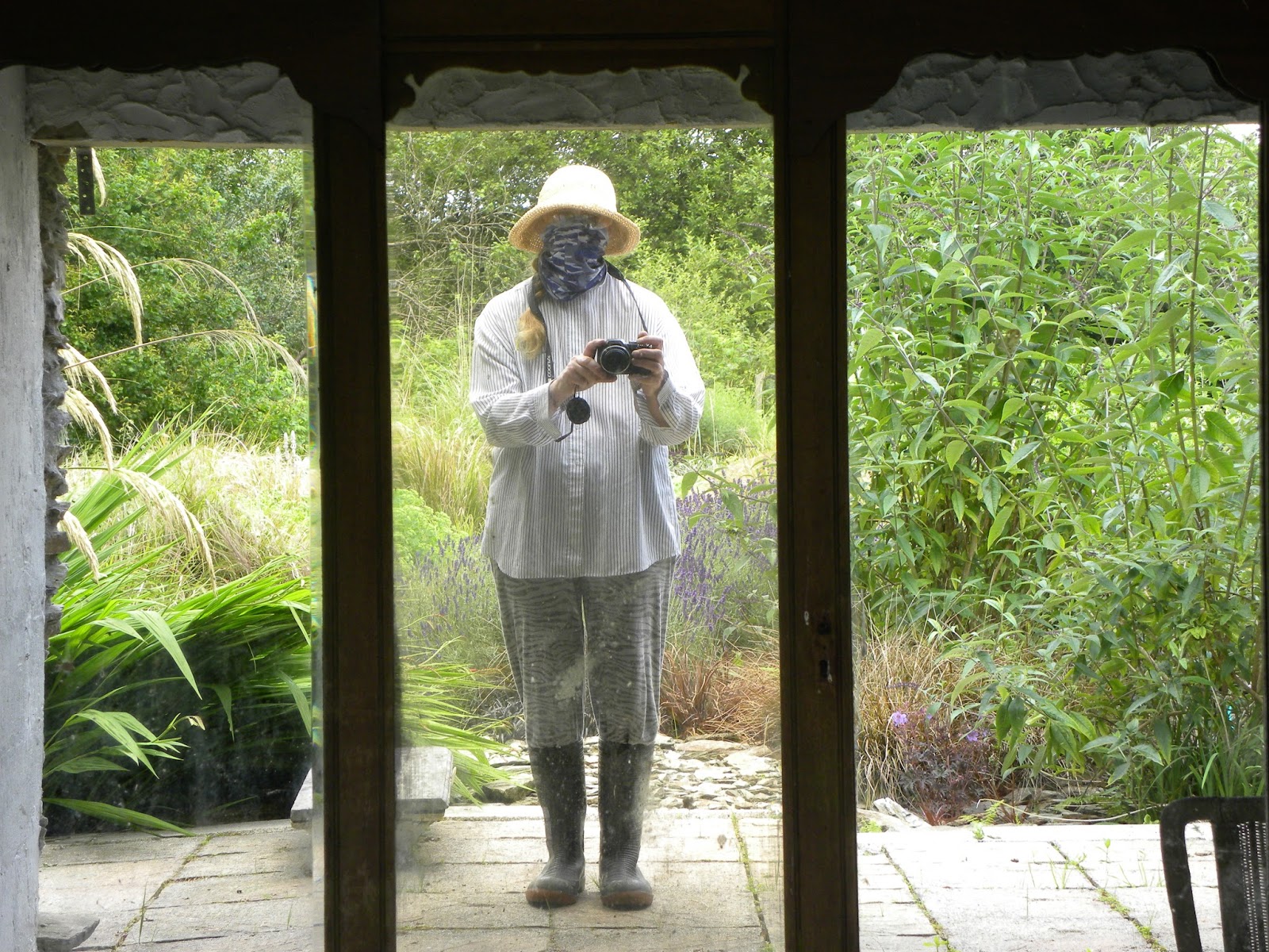 In the garden I got all the grass cut. Here I am modelling the latest in garden couture, I started off in shorts and the long sleeved shirt but after a horsefly bit me on the neck I opted for a total cover-up. I am the sort of person who gets bitten and then reacts badly to the bites so I wasn't taking any chances. Funnily enough after a shower the flies left me alone when I sat out in the sun with a book and an ice cream.