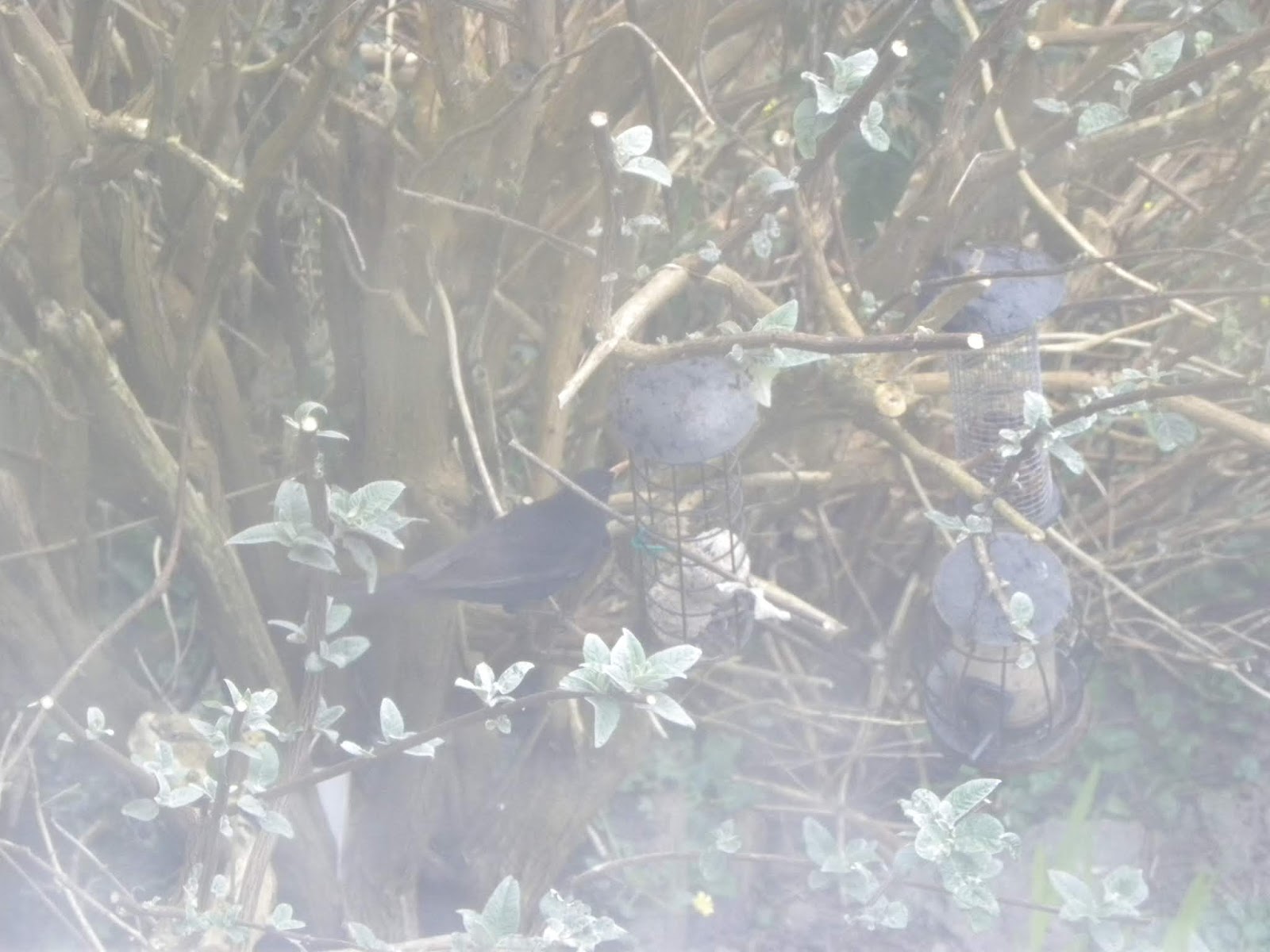 First thing this morning the storm despite all the dire warnings didn't seem too bad. With the gusting wind blowing from the south west the front of the house was sheltered by our neighbour's house. That gave the blackbird a chance to feed on fat balls in the feeder. (It's a fuzzy photo because I took it through an upstairs window.) However we could see the long grass between the houses blowing and rippling as the wind caught it.